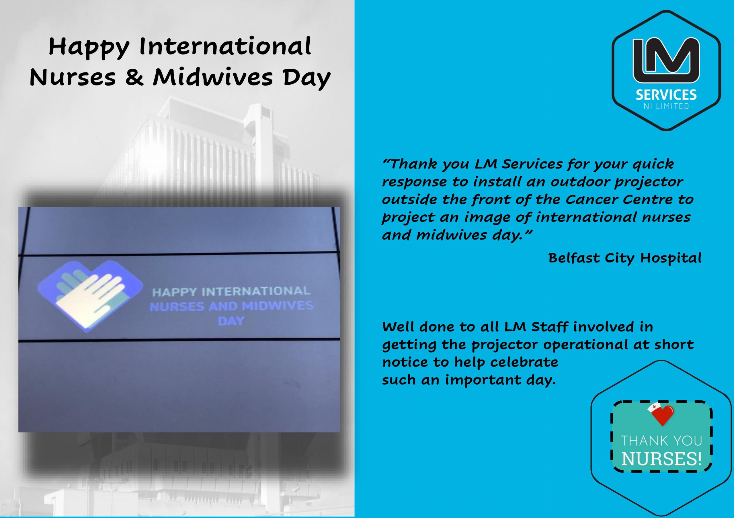 LM Services were pleased to have been involved in installing a projector at Belfast City Hospital to project images for International Nurses and Midwives Day. Well done to all our team who made this possible and thank you to all our wonderful NHS Nurses and Midwives #thankyouNHS.