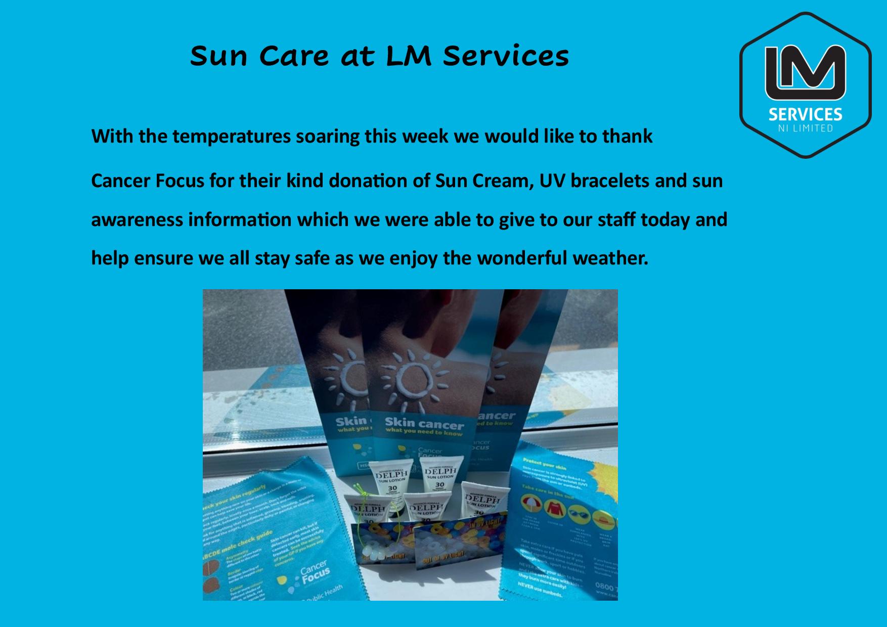Thank you to Cancer Focus for the kind donation to our staff of Sun Cream, UV Awareness Bracelets, Sun Protection Cloths and Cancer Awareness information. We were pleased to be able to distribute these to our staff to help provide them with information and keep them safe in the sun during this exceptional hot weather.
