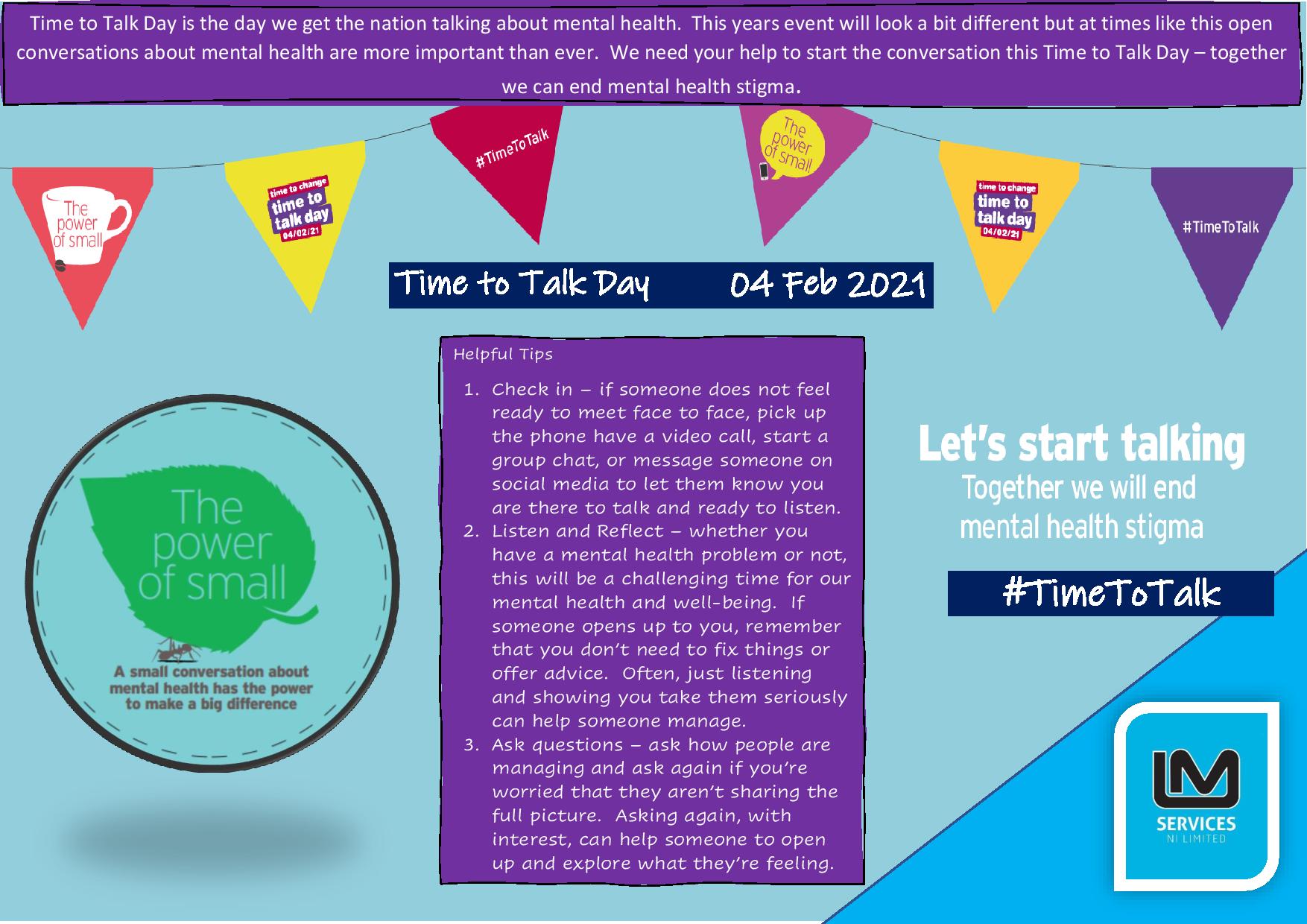 On 4th February it is #TimetoTalk 2021 with the theme being the Power of Small. Every action, no matter how small, can make the difference to someone in our workplace and home lives. This can be anything from simply asking how someone is, having a chat, messaging someone, and just making sure that they know that no matter what is going on that someone is there to listen. Any action, no matter how small can make a big difference.